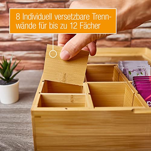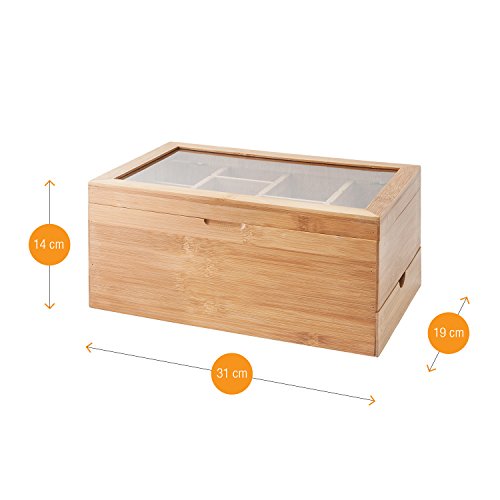 Amazy - صندوق شاي من الخيزران مقاس كبير جداً امازي - 31 × 19 14.5 سم - علبة تخزين خشبية مزخرفة مع 8 فواصل قابلة للتعديل ودرج