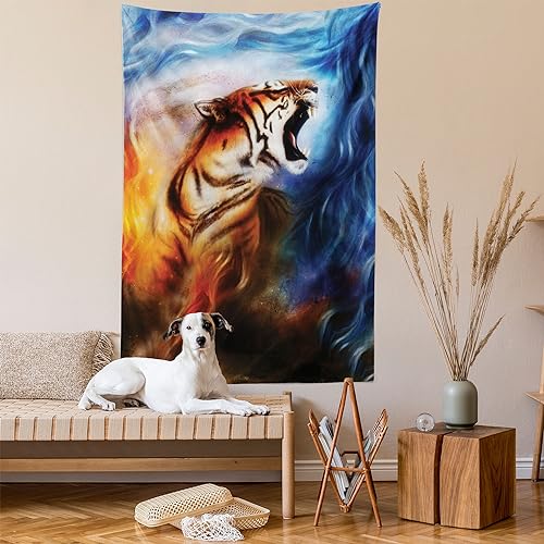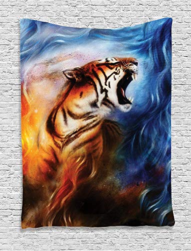 ambesonne - Ambesonne Savannah Tapestry, Wild and Angry Tiger Portrait Blue Brave Mammal Forest King Roar Print, Wall Hanging for Bedroom Living Room Dorm Decor, 60" X 80", Orange Black and Blue