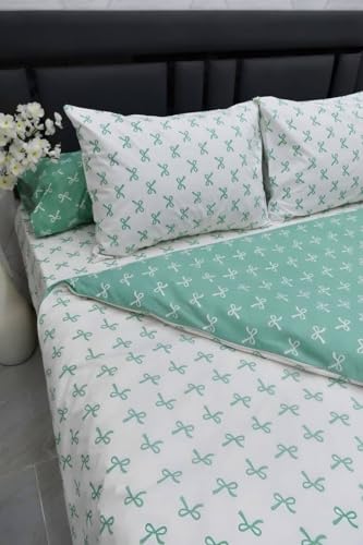 Generic - طقم غطاء لحاف قطن عامري، أبيض وأخضر بنقشة فيونكات، مقاس كبير 220×240 سم مع 2 كيس خدادية 50×70 سم، بسوستة، معالج ضد الوبرة