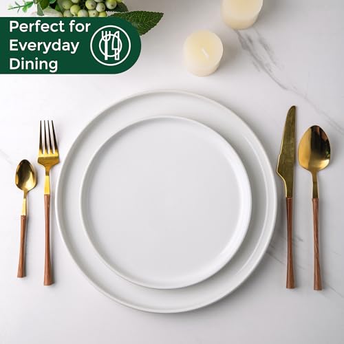 - GOOD SHAPE AND MULTI-PURPOSE: The flat dinnerware set creates a modern and minimalist table setting.The shape is great as it makes. They are easier to handle and hold and they stack really well without taking up much space, stack and nestle nicely in your cupboard or shelves. Our Dinnerware set is microwave, dishwasher and freezer safe. Perfect for every day use, indoors or out, ideal for any kitchen.