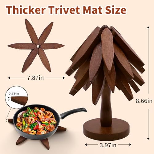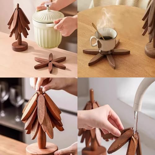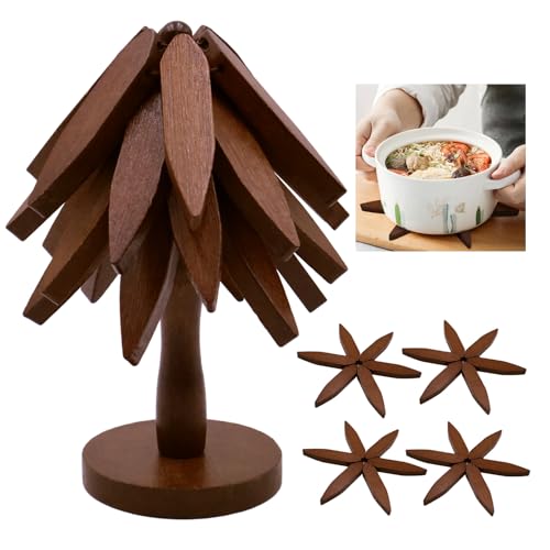 AmoreTempo - Wooden Tree Coasters Tree Trivets for Hot Dishes 4 Wooden Trivets +1 Stand Tree Pot Holder for Restaurant Tree Shape Table Insulation Collapsible Trivet Tree for Pans Bowl Teapot Hot Holder