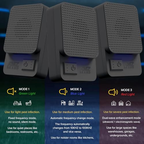 - مكبرات صوت قوية تعمل بالموجات فوق الصوتية: يتميز طارد الفئران الداخلي هذا بقدرة 8 W لكل جهاز (إجمالي 16 W). ملاحظة: قد ينزعج بعض الأشخاص والحيوانات من صوت طارد الفئران في الوضعين الثاني والثالث، ويحدث ذلك لأن لديهم أجهزة سمعية أكثر حساسية من غيرهم. أيضًا، من الطبيعي ألا يسمع بعض الأشخاص الصوت على الإطلاق (هذا لا يعني أن المنتج لا يعمل). إذا كنت منزعجًا من الصوت في الوضعين الثاني والثالث، فما عليك سوى التبديل إلى الوضع الأول لأنه الوضع الأكثر هدوءًا.