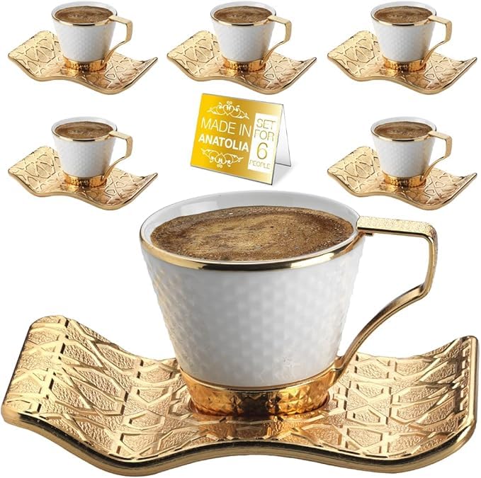 - COMPLETE SET: Includes 6 matching coffee cups and saucers, perfect for serving Turkish coffee or espresso in authentic Anatolian style