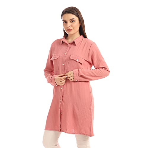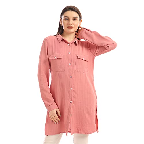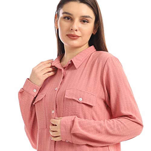 Andora - Andora Chest Flap Pockets Solid Buttoned Shirt - Dusty Rose-M, womens