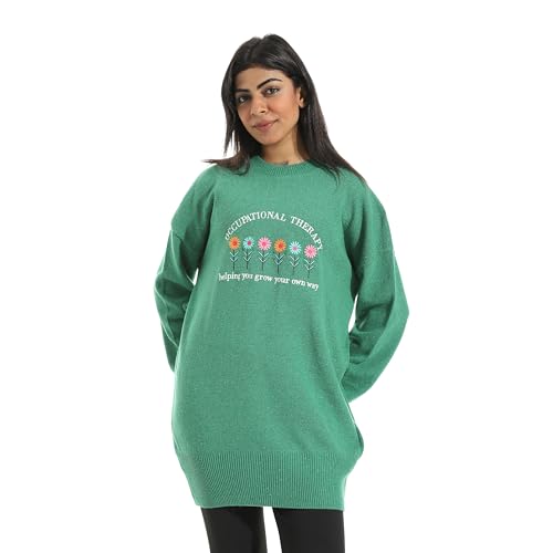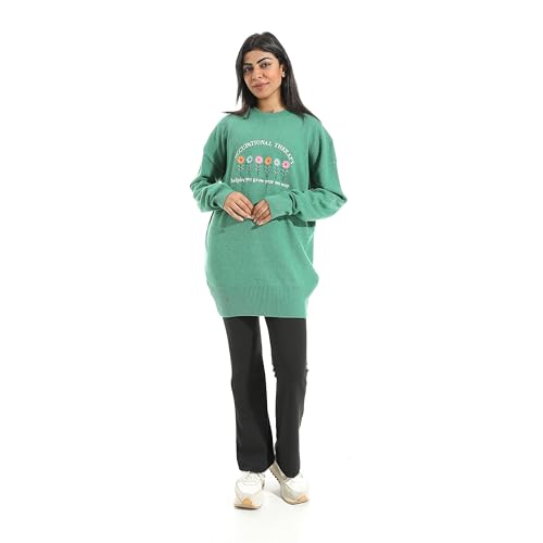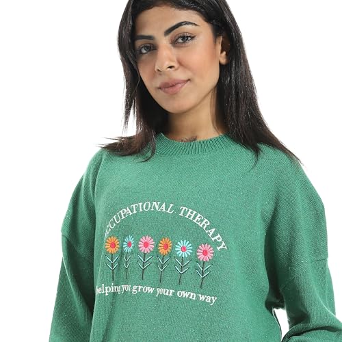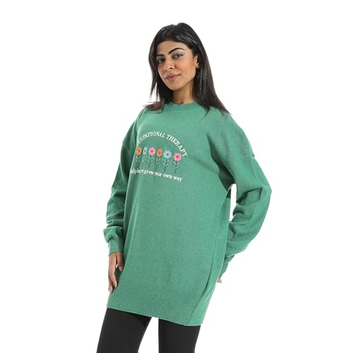 Andora - Andora Embrodried Flowers Shapes Long Sleeves Green Pullover_Green_Free