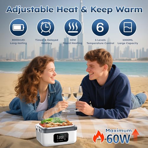 - [Adjustable Temperature & Keep Warm] -- The rechargeable electric lunch box for adults delivers 60W of power, higher than most products on the market, ensuring even heating. the food warmer offers adjustable temperature settings (90/85/80/75/70/65℃) and heating times (20/30/40/50/60 minutes). After heating, it automatically switches to keep warm mode.