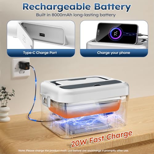 - [Cordless Electric Lunch Box] -- This heated lunch box is powered by 8000mAh rechargeable battery and a 20W fast charging adapter, Whether you're at the office, traveling or camping, enjoy hot meals without needing a socket. It also doubles as a power bank to charge your phone or other devices, offering ultimate convenience wherever you go.
