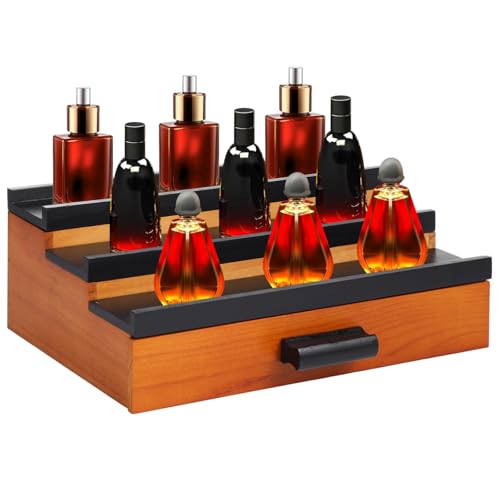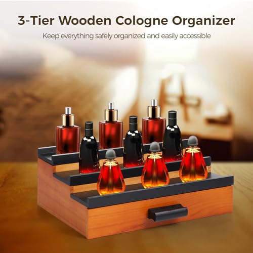 Anjetan - منظم كولونيا خشبي، رف تخزين العطور من 3 طبقات مع مساحة تخزين مخفية ودرج، رف عرض للعطور، حامل منظم للعطور للرجال