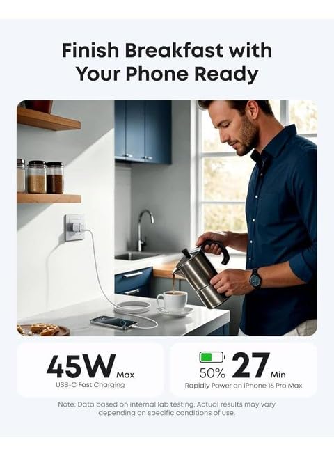 - محتويات العبوة: شاحن نانو (قدرة 45 وات)، بكابل USB-C إلى USB-C بطول 1.83 م، دليل ترحيب «اللغة العربية غير مؤكدة» من انكر.