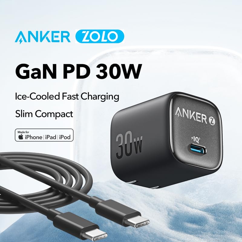 Anker - Anker Zolo IQ Compact Charger, 30W USB-C Port with Type-C to Type-C Cable, Enhanced Temperature Control, Compact Size, 3X Faster Charging, Compatible with iPhone, iPad, Samsung, Pixel and More