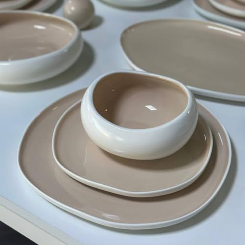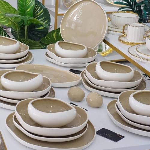 Generic - طقم ادوات مائدة عصرية انيقة من انخ-هوم سابلايز، بلونين بيج وابيض، 27 قطعة، تتضمن اطباق واوعية واطباق تقديم