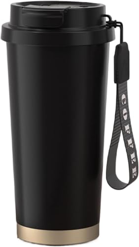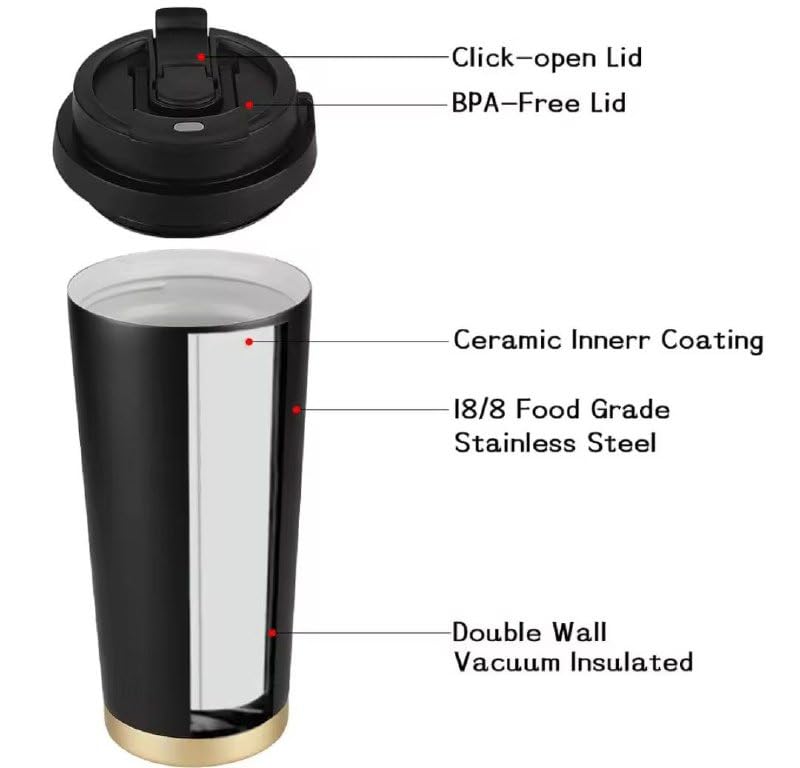 Generic - كوب سفر معزول فاخر من انخ-هوم سابلايز، بجدار مزدوج من الستانلس ستيل، غطاء خالٍ من البيسفينول ايه بتصميم يفتح بالنقر، اسود مع قاعدة ذهبية