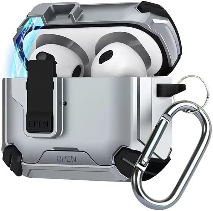 - نظام قفل آمن: يتميز بآلية قفل قوية تحافظ على الحافظة مغلقة بإحكام، وتمنع الفتحات العرضية وتحمي سماعات ايربودز الخاصة بك
