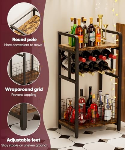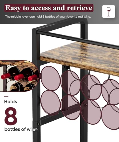 - 【3-Tier Wine Rack】: This liquor bar for home provides additional space for glasses, fruit platters and ice buckets. The middle layer can hold 8 bottles of your favorite red wine. The design of circular strip-shaped metal plate makes the wine bottle rack easy to access and retrieve. The bottom of the wine holder can store wine bottles of different sizes, and the surrounding grids can effectively prevent them from tipping over.