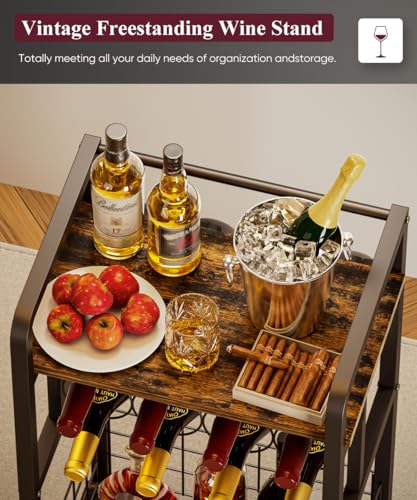 - 【Vintage Freestanding Wine Stand】: This vintage liquor shelf designed for families is an ideal choice for wine lovers. The vintage style makes your corner more atmospheric! It's a mini bar that not only can effectively organize your wine, syrup, champagne and whiskey in a compact unit, but also can accommodate your coffee machine, mug, dessert and so on. Totally meeting all your daily needs of organization and storage.