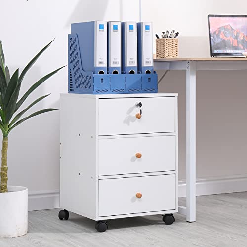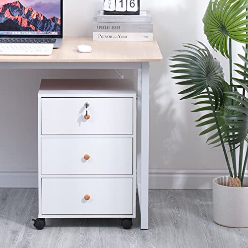 Ansley&HosHo - Ansley&HosHo Mobile File Cabinet with 3 Drawers, Slim Bedside Drawer Unit, Under Desk Rolling Storage, Lockable Wooden Filing Cabinet, Home Office Printer Table on Wheels (White)