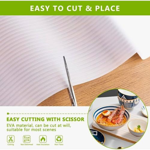- سهل الاستخدام: يتم توصيل بطانات أدراج من انز بأكثر الأحجام شيوعًا وهي مقطوعة مسبقًا بحيث يمكن استخدامها بسهولة. نظرًا لسهولة قص البلاستيك المبطن بمادة ايفا، يمكنك قص هذه البطانة إلى أي حجم وشكل تريده باستخدام مقص عادي. يمكنك وضع المفارش مباشرة في الدرج أو الخزانة وتقليم الزوائد.