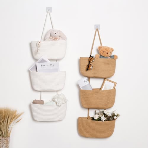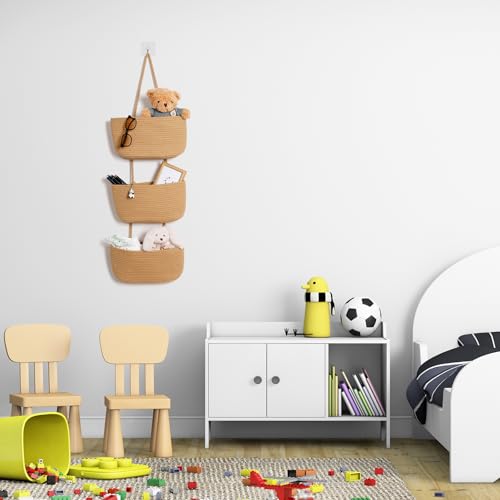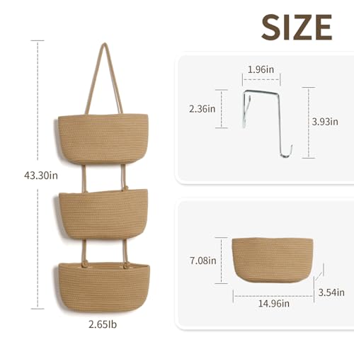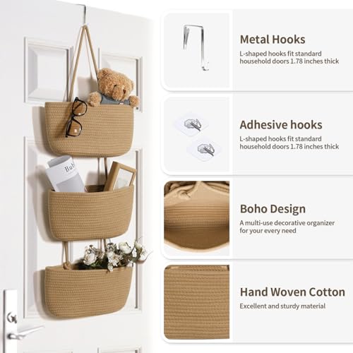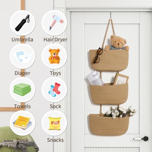 ANTIS'S HOME - ANTIS'S HOME Over The Door Organizer Hanging Basket, 3-Tier Woven Cotton Wall-Mounted Nursery Storage Organizer Bag Boho Decorative Hanging Nursery Baskets for Living Room Bedroom - Honey