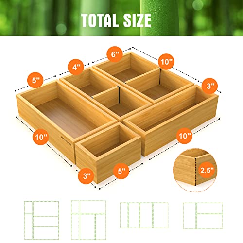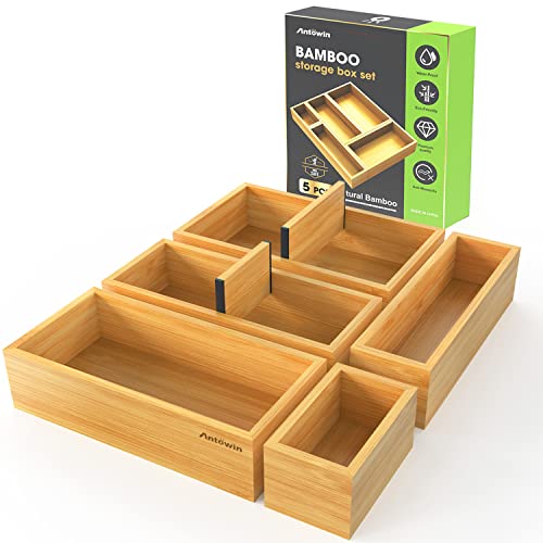 ANTOWIN - منظم أدراج من الخيزران من انتووين، مجموعة صناديق تنظيم الأدراج، 5 علب تخزين فردية، منظم أدراج للمطبخ وطاولة الزينة وخزانة المؤن والجراج والمكتب