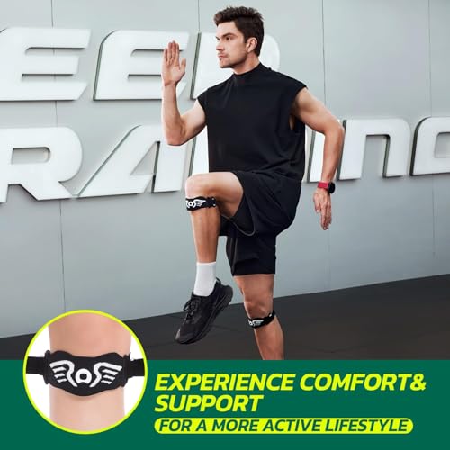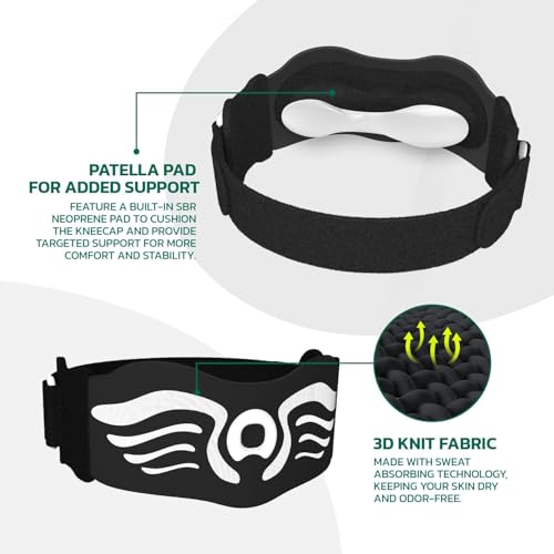 - [Angel Wing Design for Style and Protection] Inspired by the elegance of angel wings, this patella band seamlessly blends functionality with a unique aesthetic. Its thoughtful design ensures full knee protection while maintaining a sleek, modern appearance. The central logo guides easy alignment, ensuring the strap fits securely and performs effectively during workouts or daily use.