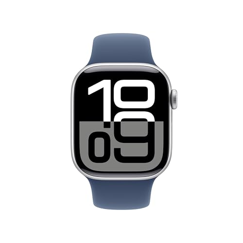 Apple - Apple Watch Series 10 GPS 42 mm Smartwatch with Silver Aluminium Case with Denim Sport Band - M/L. Fitness Tracker, ECG App, Always-On Retina Display, Water Resistant