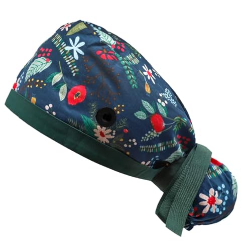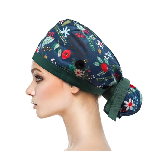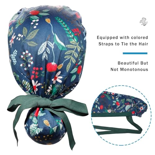Aputue - Home Working Cap, Adjustable Ribbon Tie Ponytail Hats for Women, Long Hair Head Covers Hair Caps with Buttons and Sweat band, Long Hair Scrub Hats Ponytail Holder for Women