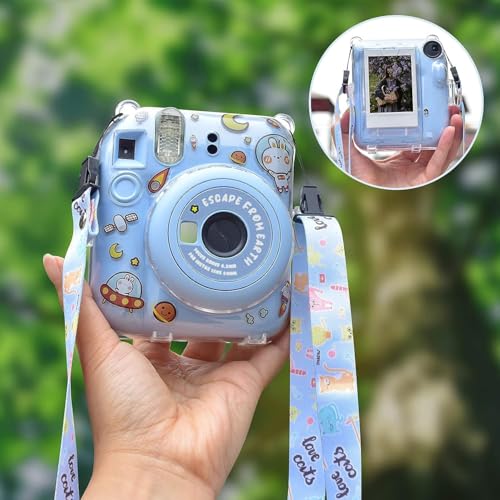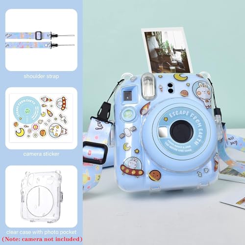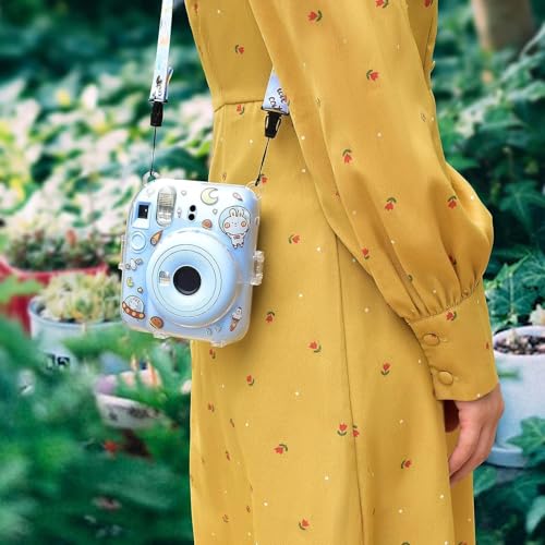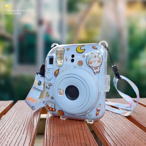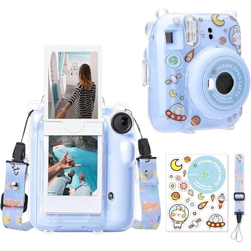 Aputue - Instax Mini 12 Clear Case, Shoulder Strap and Beautiful DIY Camera Sticker, Case for Mini 12 Instant Camera with Back Photos Pocket, Adjustable Hard PVC Protective Case (Blue), Transparent