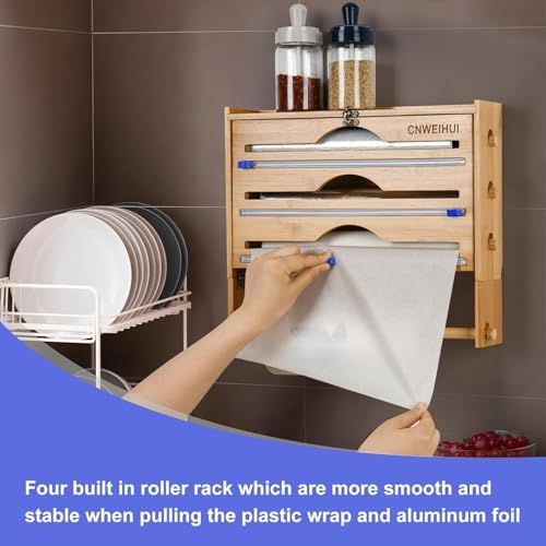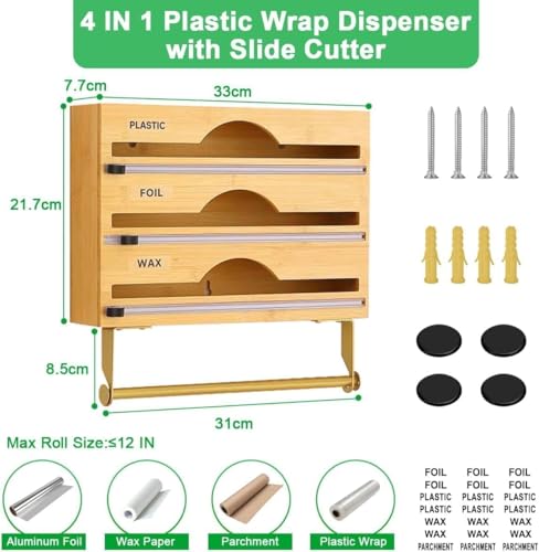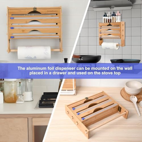 Aputue - Plastic Wrap Dispenser, 3-in-1 Kitchen Organizer with Built-in Cutter for Aluminum Foil & Wax Paper, Space Saving Cabinet Storage Solution for Home & Kitchen Essentials Organization