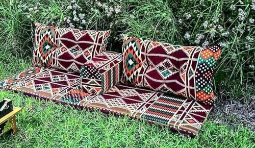 Arabian House - قدعة العربية من البيت العربي 2 متر طول * 60 سم عرض ارتفاع 10 سم ظهر مزود بثنين وسادة القطن مقاس 1م * 50 سم تكاية مصنوعة من قماش العربية HAND ميد مزود بإسفنج