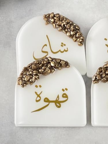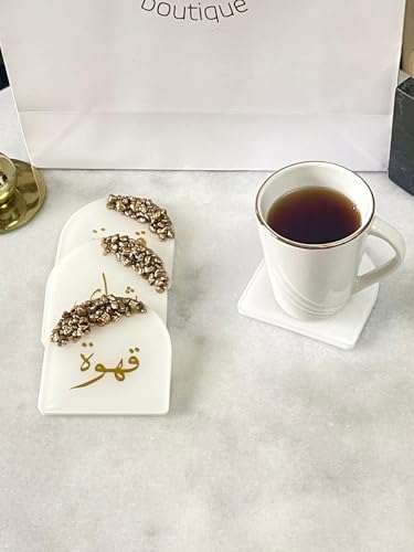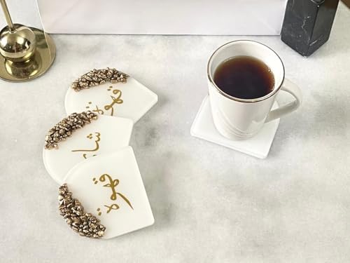 - تصميم أنيق: قواعد أكواب من الراتنج الأبيض مزينة بخط عربي أنيق باللون الذهبي، مع تفاصيل زخرفية من كريستال معدني ذهبي تضيف لمسة فاخرة وأنيقة.