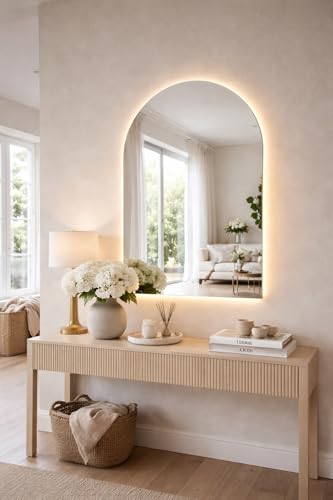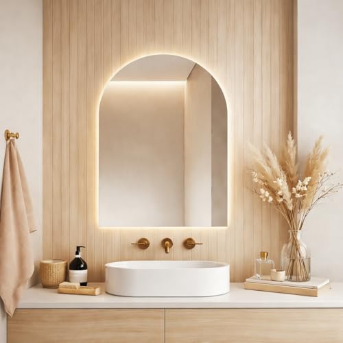 Generic - مراة حائط LED مقوسة (70 × 50 سم) مع اضاءة خلفية دافئة | زجاج فاخر 4 ملم وحواف مصقولة ومقبس طاقة | مراة زينة عصرية للحمام وغرفة النوم وغرفة الملابس - ذهبي/ضوء دافئ