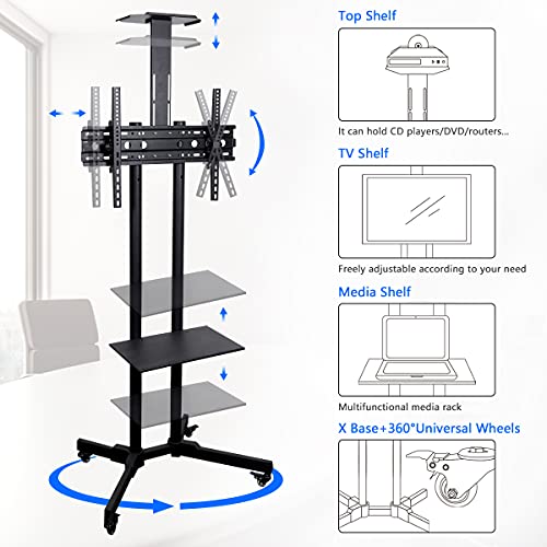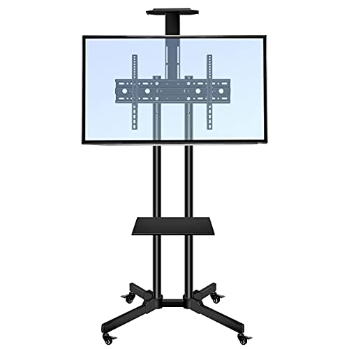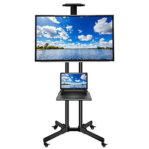 A APIYOO - عربة تلفزيون بعمود مزوج مع عجلات بقفل لتلفزيونات 32-65 بوصة، ستاند ارضي قابل للحركة والتعديل مع رف للاب توب، رفوف اجهزة ميديا للمكتب والمنزل، حمولة حتى 110 رطل اقصى فيسا 600×400 ملم من اريش، اسود
