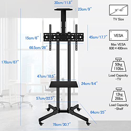 - 【قوة عالية】يمكن لعربة التلفزيون حمل ما يصل إلى 110 باوند. تضمن المادة المتينة أن حامل التلفزيون المحمول هذا يمكنه تحمل الأحمال العالية. حجم المنتج: الطول 780 ملم × العرض 640 ملم × الارتفاع 1750 ملم. أقصى وزن للحمل لرف الوسائط القابل للتعديل هو 25 باوند.
