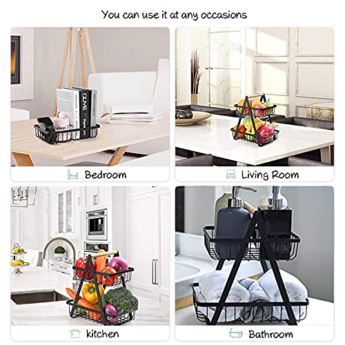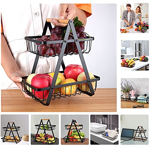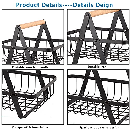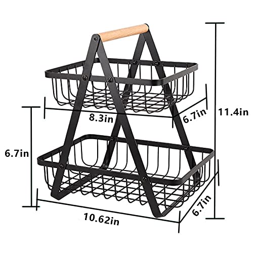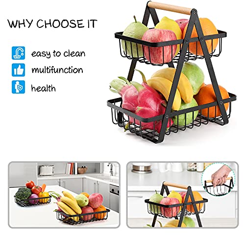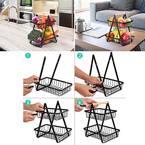 ARLRICH - farmhouse 2-tier fruit basket for kitchen detachable metal kitchen storage basket for fruit snacks vegetables durable fruit tray bowl with wooden handle for kitchen counter (black)