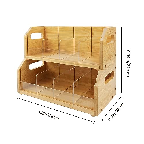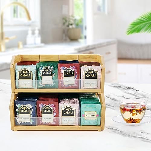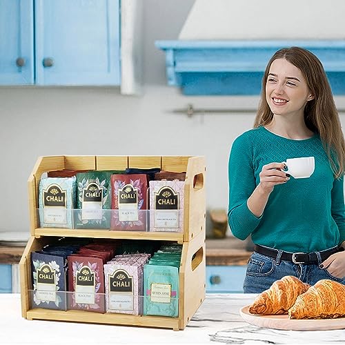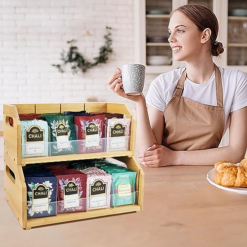 Arriart - حاويات تخزين اكياس الشاي من الخيزران اريارت - منظم شاي لخزانة - رف ورف وحامل القهوة للمكتب والمطبخ - خشبي بطبقتين