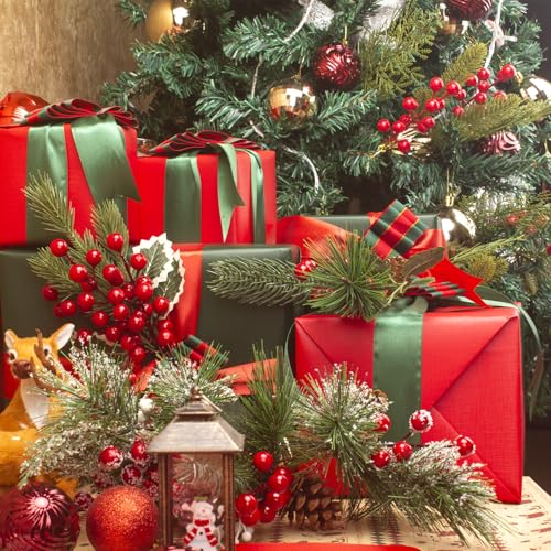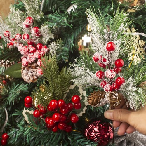 Grunyia - Artificial Pine Branches, 6 Pack Red Berry Stems, 9.8 Inches, Christmas Floral Picks and Sprays, Assorted Pine Picks, Holly Sprigs Greenery, Christmas Picks for Crafts, Holiday DIY Gift Wrapping
