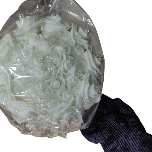 - ELEGANT BRIDAL BOUQUET: Beautiful artificial white rose bouquet featuring delicate foam roses with sparkling glitter accents for a romantic wedding aesthetic