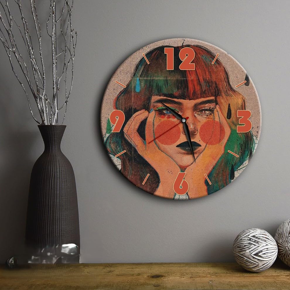 - عناصر التصميم: ساعة حائط فنية تتميز بألوان برتقالية وخضراء نابضة بالحياة بنمط بورتريه عصري، مما يخلق قطعة مميزة معاصرة مذهلة