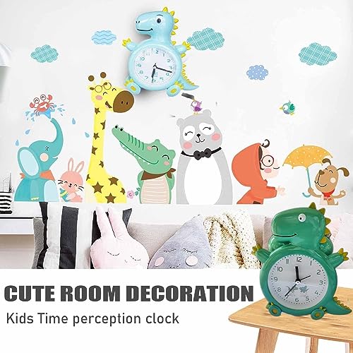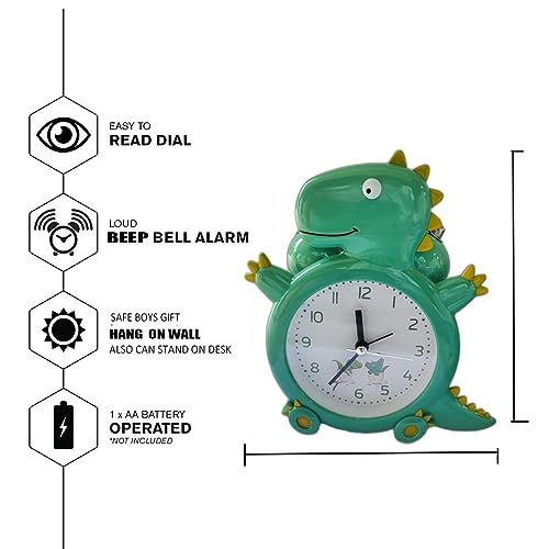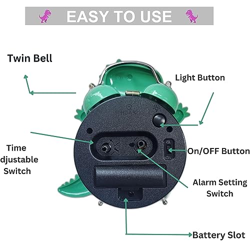 ARTLABEL - Dino Shape Analog Battery Operated Alarm Clock with Loud Bell Alarm Clock Night Light for Kids Students Study Room Home & Office Decor Gift (Green)