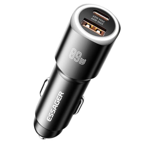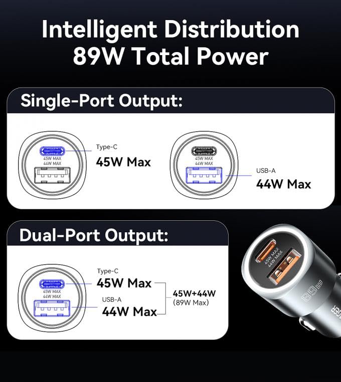 - ✪ 89W Mighty Power: This charger offers a massive total power up to 89W (45W for Type-C + 44W USB-A), allowing you to charge two devices together (laptop, phone, or two phones) as quickly as you drive.