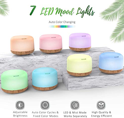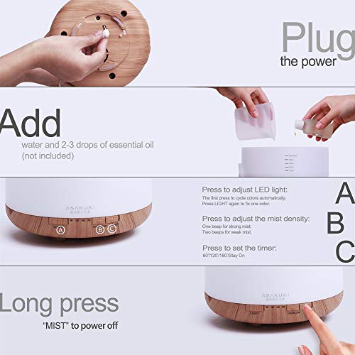 ASAKUKI - موزع زيوت عطرية 500 مل مرطب للعلاج بالروائح العلاجية مع إضاءة بـ 7 ألوان، موزع منزلي صغير للاسترخاء من اساكوكي