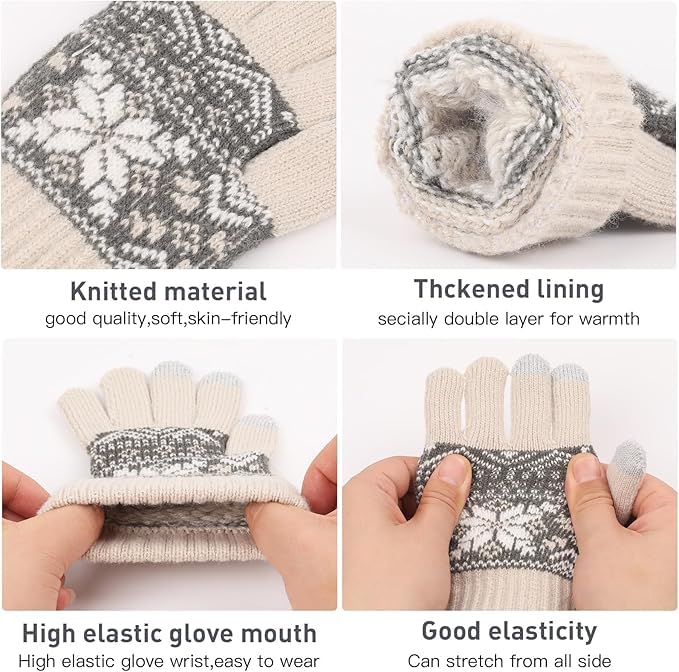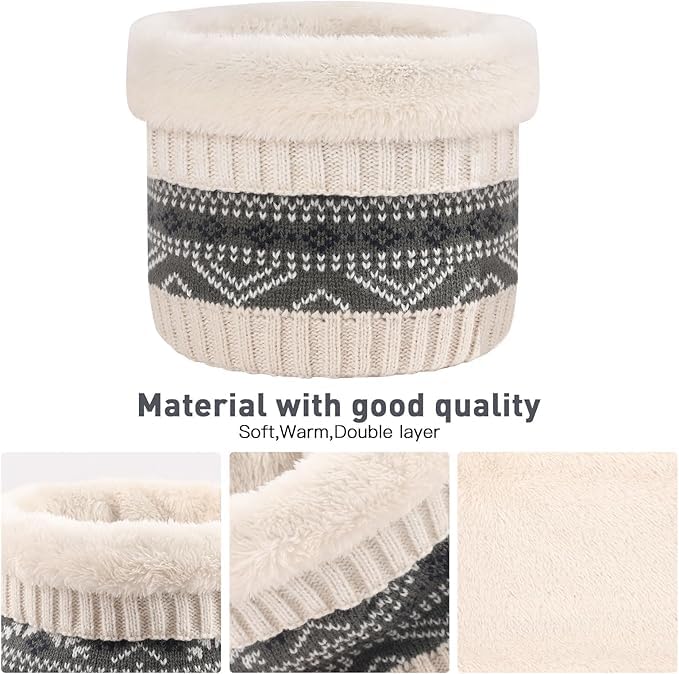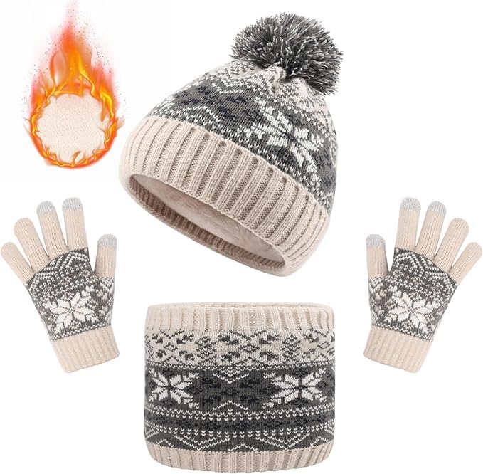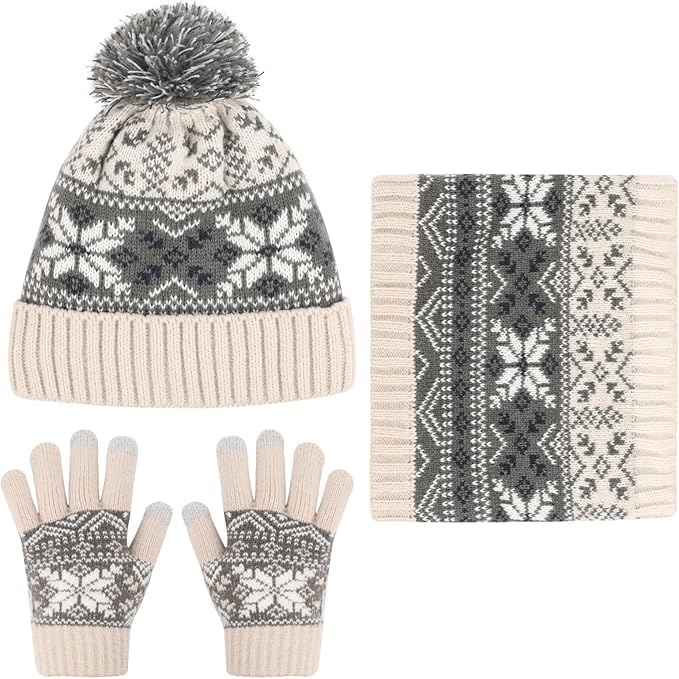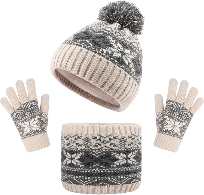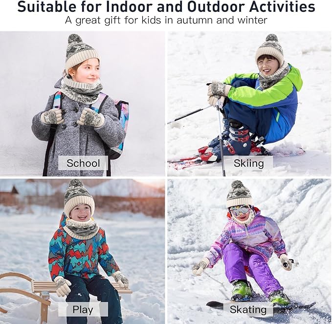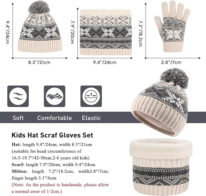 ASSHMHTC - Kids Beanie Hat Scarf Gloves Set, Inner Fleece Lining, Stripe Snow Pattern Thermal Knitted Beanie Hat, Circle Scarf, Touch Screen Gloves Set for Girls Boys Children Aged 1-6 Years Old
