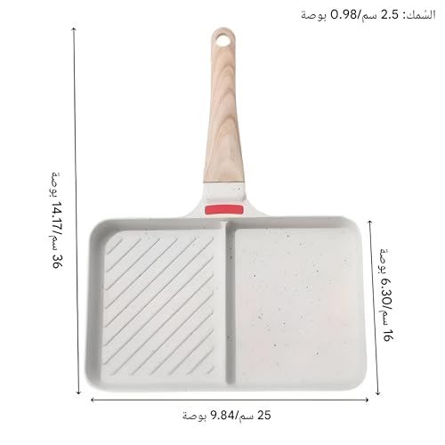 - Care and dimensions: measures 40 cm by 25 cm by 5 cm; recommended hand washing to preserve non-stick coating and wooden handle; designed to withstand high temperatures and maintain even cooking across different cooking methods.