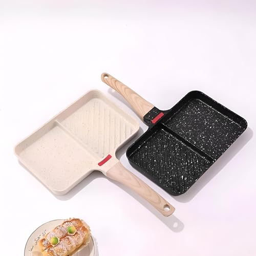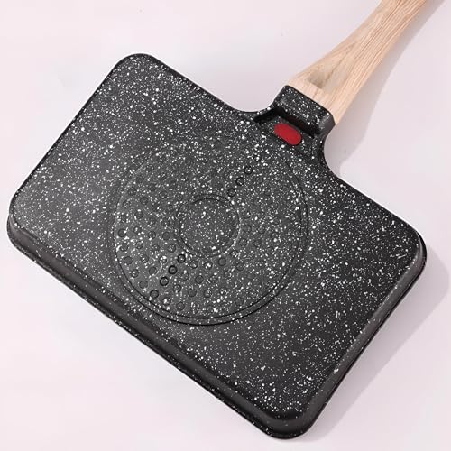 - Granite double skillet with a wooden handle combines a versatile 2-in-1 design and a divided grill to cook multiple items at the same time, boosting meal prep efficiency; its non-stick surface ensures easy food release and quick cleanup while the granite body delivers superior heat distribution and retention for even cooking. The two-burner layout supports independent heat zones for searing and simmering, the wooden handle stays cool to touch for safe handling, .