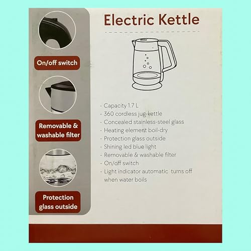 - "Imagine a quiet morning moment and your senses have wake up the blue light shine emitted from this stylish kettle. It is not only a water heating tool, it is a piece of art that complements your kitchen with its sheer charm. Watch the water bubbles dancing gracefully inside its durable glass structure, while warmth flows to enrich your day. With its washable filter and smart dry boiling protection, you can enjoy your perfect cup every time, with safety and confidence. It is the perfect companion for every tea and coffee lover, who appreciate beauty and quality in the every detail of their lives