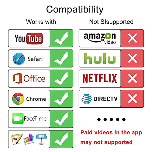 - 【يدعم برامج فيديو متعددة】يدعم محول اتش دي ام اي الرقمي ايه في يوتيوب وفيسبوك واي دي ام بي وكويك فليكس وايه بي سي وان بي سي وفوكس ومايكروسوفت اوفيس ومكالمات الفيديو من فيس تايم وسكايب وواتس اب والمزيد. ولكن يرجى ملاحظة أن محول HDMI لا يدعم التطبيقات مع حماية حقوق الطبع والنشر للفيديو "اتش دي سي بي" مثل نتفليكس وأمازون فيديو واتش بي او جو وهولو وسكاي كيو وهوندا موتور أكثر.