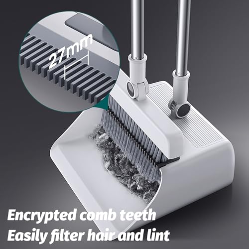 - 【Self-Cleaning Dustpan Teeth】Built in scraper and comb/Teeth, which is convenient to scrape the hair and debris on the broom into the standing dust pan, no need to drag by hand, easy to clean human hair/pet hair and dust on the broom.