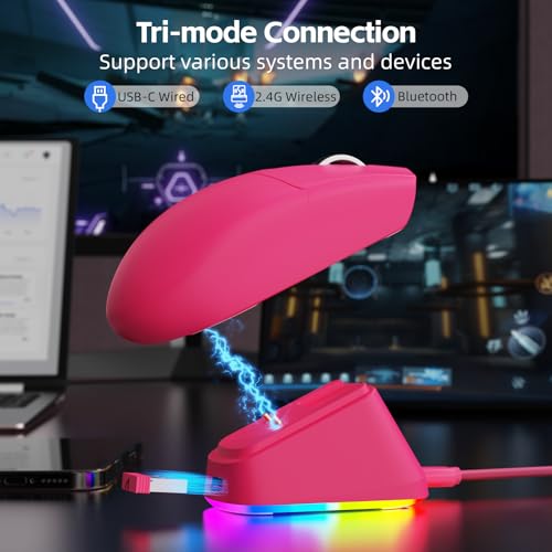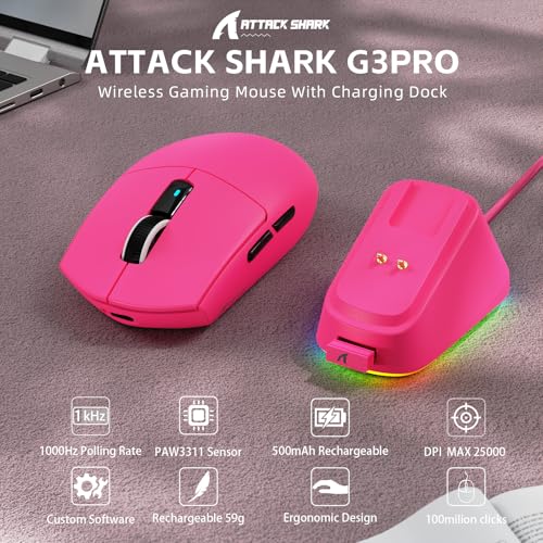 ATTACK SHARK - ATTACK SHARK G3PRO Wireless Gaming Mouse with RGB Charging Dock, 2.4G/USB-C Wired/BT PAW3311 Optical Sensor 1K Survey Rate Adjustable 25K Dpi, Battery 500mAh Ultra Light 59g Berry Red