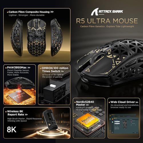 ATTACK SHARK - ATTACK SHARK R5 Ultra Carbon Fiber Wireless Gaming Mouse,39g Superlight Hollowed-Out,PAW3950MAX Optical Sensor Nordic 52840 MCU 8K Polling 42K DPI,Tri-Mode Programmable Mice with Coiled Cable-Black