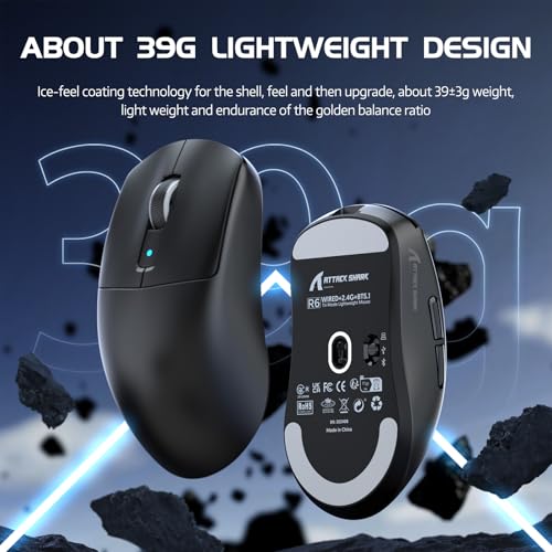 ATTACK SHARK - ماوس العاب لاسلكي شارك R6 8KHz من اتاك، سوبر لايت 42 غرام، نورديك 52840 MCU، مستشعر العاب بيكسارت PAW3950MAX BT/2.4G/سلكي، 6 DPI قابلة للتعديل حتى 42000، بطارية قابلة لاعادة الشحن 250mAh، للكمبيوتر
